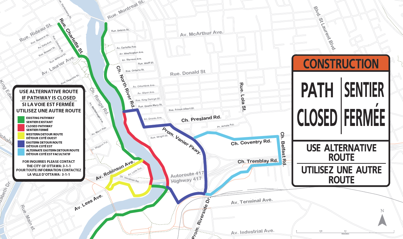 A section of the Rideau River multi-use pathway behind the Ottawa U campus on Lees Avenue is closed until further notice due to light rail construction. View a map of the affected area and suggested detours.